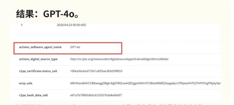 有专业人士在metadata2go.com上对image 2生成的图片进行元数据提取。发现在actions_software_agent_name一栏上记录着GPT-4o。