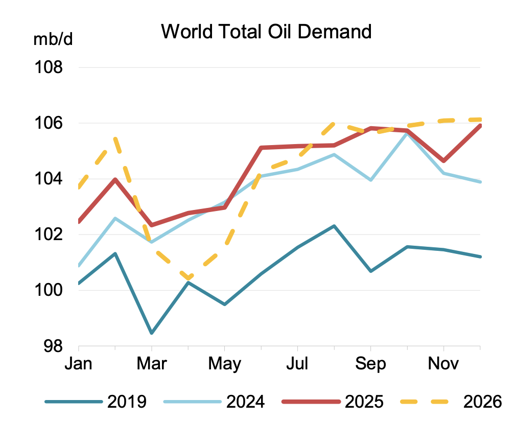 不同年份全球石油总需求月度走势,单位为百万桶/日。图源:IEA