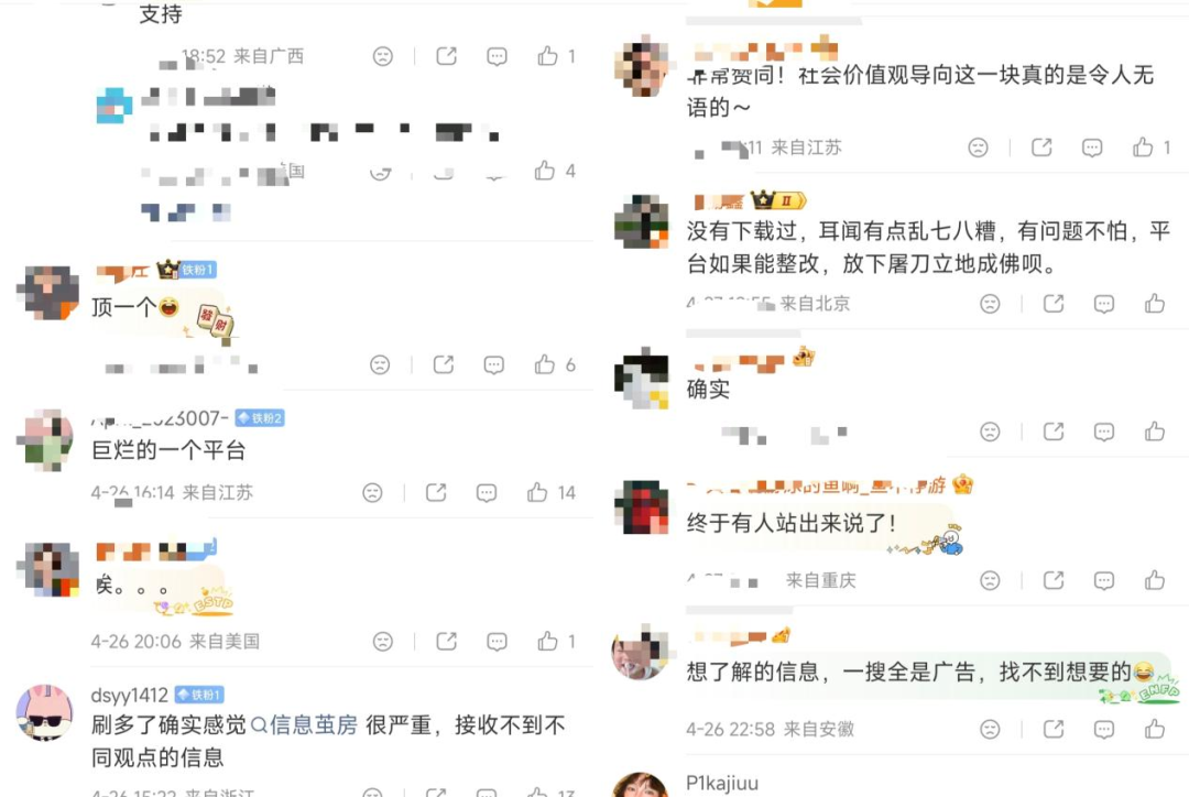 对于俞浩的“大胆直言”,一些用户也纷纷在评论区中附和:“刷多了确实感觉信息茧房很严重,接收不到不同观点的信息”“一直不觉得这个App好”“这个平台从根上有问题,充满了炫耀、虚伪、利己和小恩惠”“想了解的信息,一搜全是广告,找不到想要的”。