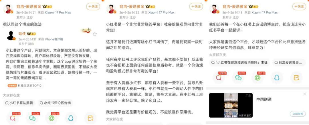 而仅仅隔了13分钟,俞浩又再度追评称,起诉小红书上造谣博主时,都应该连带平台一起起诉,“大家就是害怕这个平台,才导致如此肆意妄为推送各种未经证实的假消息。”连发三帖之后,其还于评论区强调:“小红书的算法是有意推荐作恶的。”