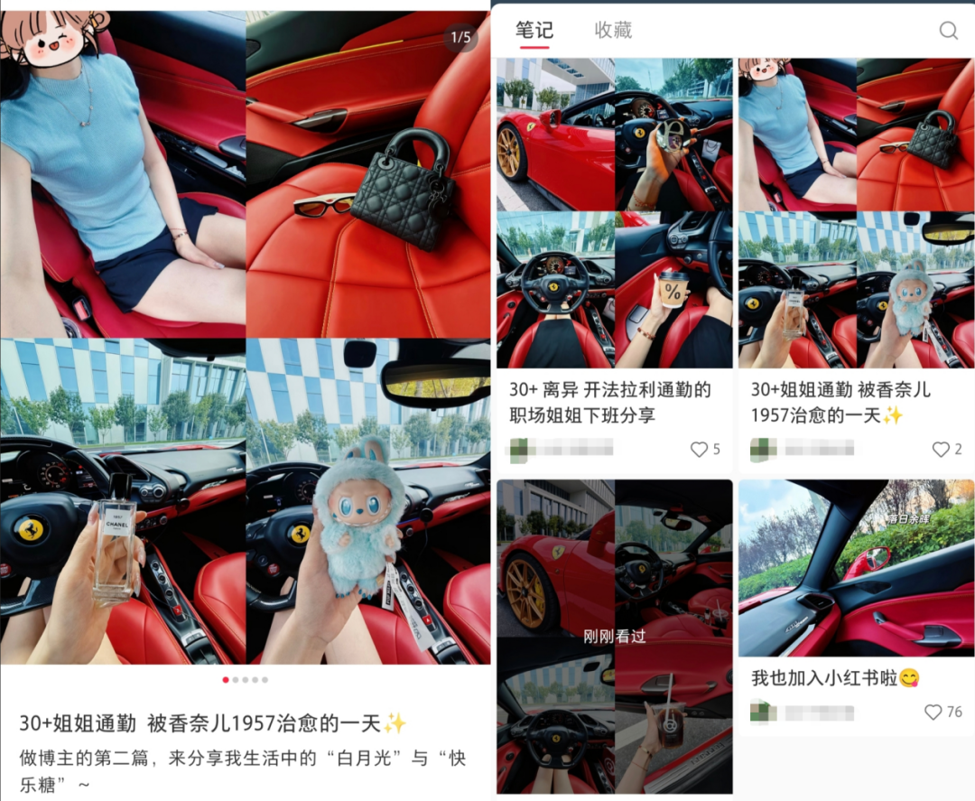 例如,有博主仍以“法拉利”“职场”为关键词打造人设。在其发布的五条帖子中,法拉利跑车连续出现,还配文称研究怎么赚更多钱,疑似意图引起用户焦虑。再比如,还有博主频频发布“开保时捷”的视频,视频封面均为其手握方向盘,并配文“人生是旷野”“28岁是有钱又自由的18岁”“经济自由,人生更自由”等,有用户评论“并不理解(炫耀)是什么心里”。