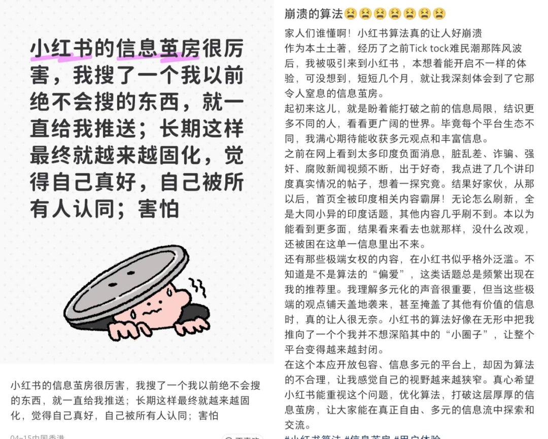 事实上,关于小红书算法和推荐机制的问题,平台早有用户吐槽“被困在信息茧房”里。
