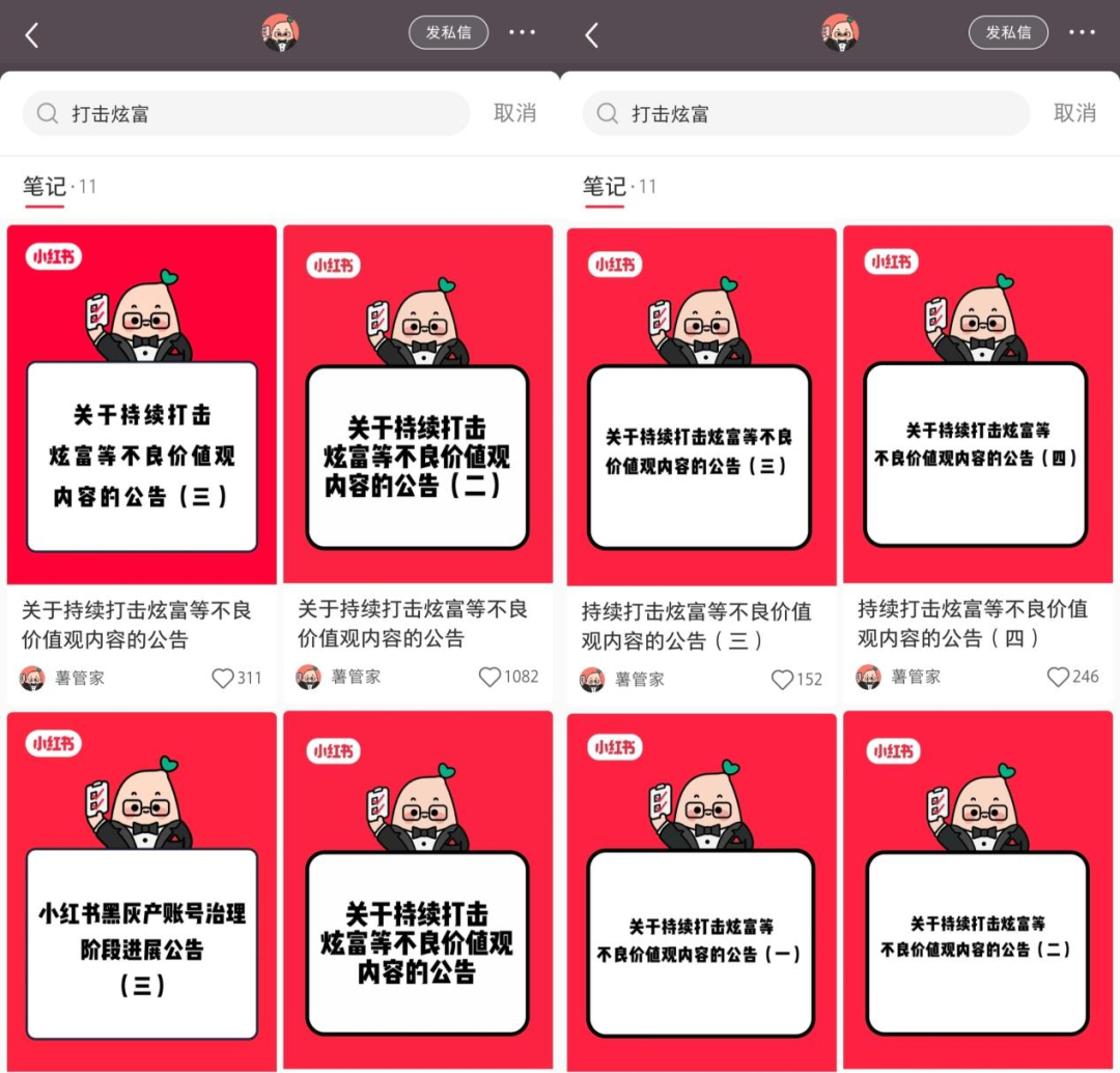同时,也有账号晒出夸张收入、炫耀远超常人的赚钱能力,炒作炫富不良价值导向内容。为此,小红书曾发布8则关于打击炫富等公告,封禁多位用户。但一直到去年年底仍屡禁不止。