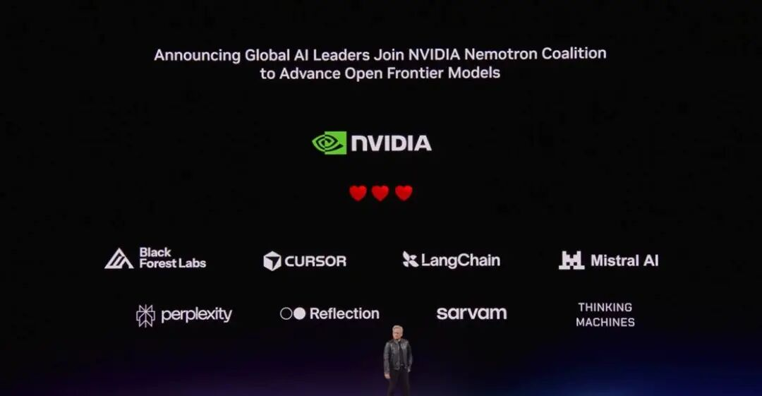 随后,在GTC 2026上,英伟达高调宣布成立Nemotron联盟。创始成员机构包括:法国的Mistral AI、美国的Reflection AI、印度的Sarvam AI,以及德国的Black Forest Labs(原Stability AI团队),它们是模型的构建者;以及LangChain与Thinking Machines Lab,属于开发框架与执行环境的构建者;以及Cursor与Perplexity这样的AI应用公司。