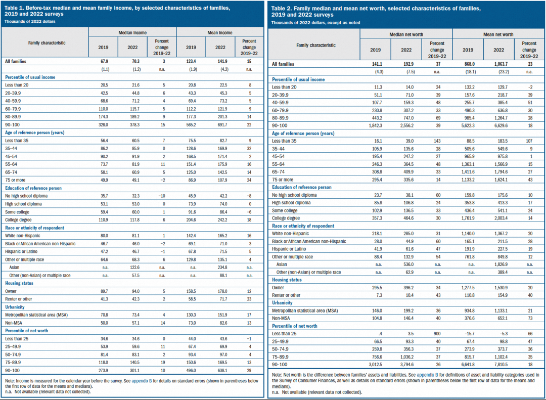 我们来看美国家庭财务状况中Table 1与Table 2的数据分析,可以看到形成了历史性对比:在对比的这三年里,普通美国家庭的实际中位数收入,仅仅像蜗牛一样微弱地爬升了3%;但与此同时,其实际中位数净资产却像坐上了火箭,暴涨了惊人的37%。这37%的财富飞跃从何而来?绝不是靠着那可怜的3%的工资结余攒出来的,而是靠着房屋净值飙升了44%、股票资产重估以及企业所有权的扩张带来的纸面富贵。