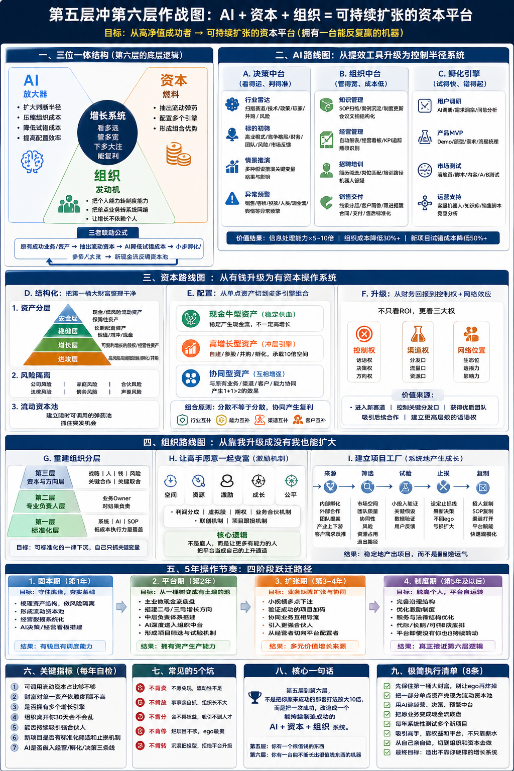 第五层核心依靠已经去掉的运气成分,更多的是依靠正确的策略和持续的执行能力及公司类型的经营性收入稳定阶层了。那第六层的跃迁在AI时代更多的就需要AI+资本+组织的持续资本扩展组合平台,才能真正实现第六层的跃迁,因为资本是财务跃迁的燃料,组织是核心的发动机,AI可以实现效率的最大化和信息、技术门槛的扁平化。这样才能给到我们创造出一个巨大的机会去冲击第六层财富的鸿沟跨越。