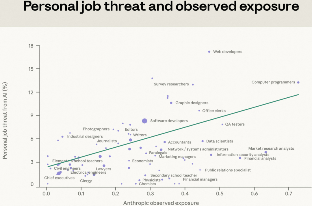 通常认为越落后越恐惧,但数据显示生产力提升最快、效率最高的那群人(如软件工程师),反而最担心被AI取代。因为效率的指数级提升让他们意识到自己岗位的“可替代性”正在加速消失。