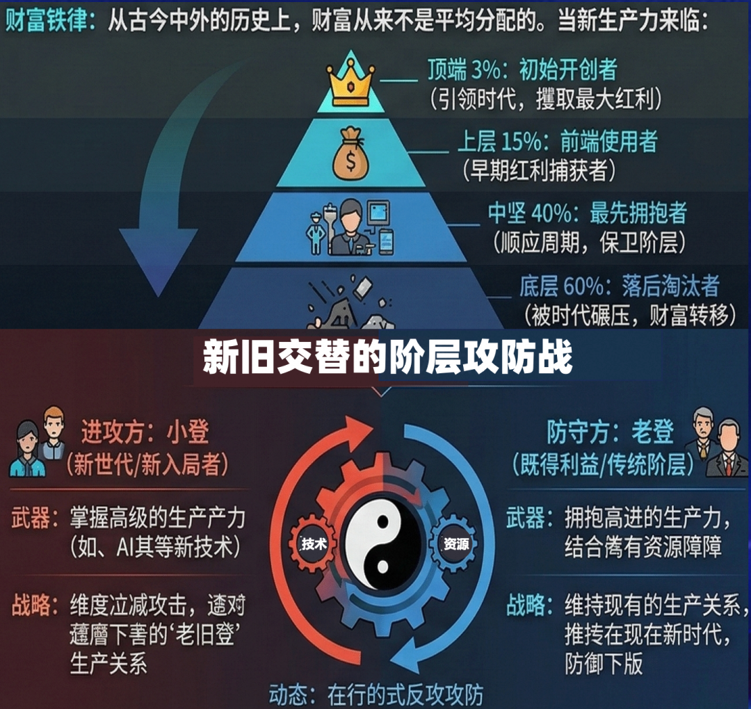 在和这么多的财富拥有者沟通下来,我感受最深的是社会的六层财富跃迁机制。AI时代最好的红利的是社会财富分配的结构正在因为新技术的诞生而重构,曾经没有机会的“小登”作为进攻方,迎来瓜分“老登”财富的机会。但对于“老登”们来说,既然拥有了这么多的“江湖地位”,自然是有两把刷子的,AI时代也只是一种“新工具”而已,“只要我能跟得上,伊然可以锁死小登的社会晋升空间……”,但是这种对抗关系变相让渡出来了新的机会给“中登”们,以前中登们的精力无法和小登竞争,财力也无法和老登抗衡,但是因为这两者开始对抗之后中登就可以坐收渔翁之利了。中登可以拼着自己对行业的理解,对结果的担责,利用过去积累的丰富经验给AI纠偏。利用这个新工具解放自己的时间,获取更高的社会地位和财富积累,反而是跃升阶层的黄金时代。