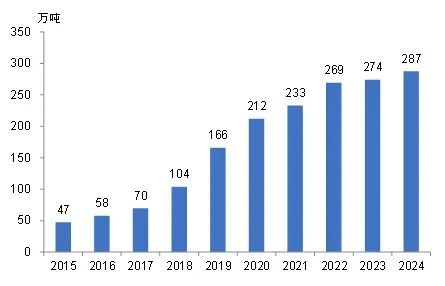 2015年-2024年我国牛肉进口总量。(图/中国肉类协会)