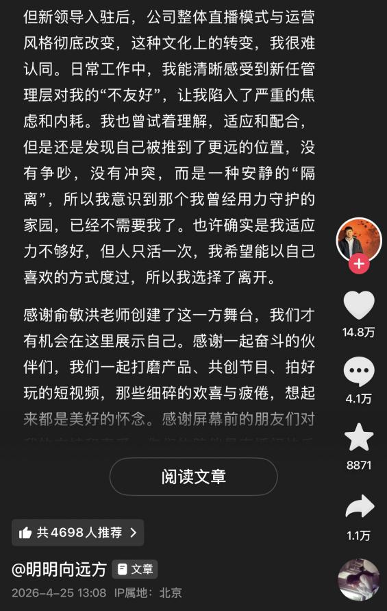 明明称,“新领导入驻后,公司整体直播模式与运营风格彻底改变,这种文化上的转变,我很难认同”,还能清晰感受到新任管理层的不友好,并且让他陷入了一种安静的“隔离”。