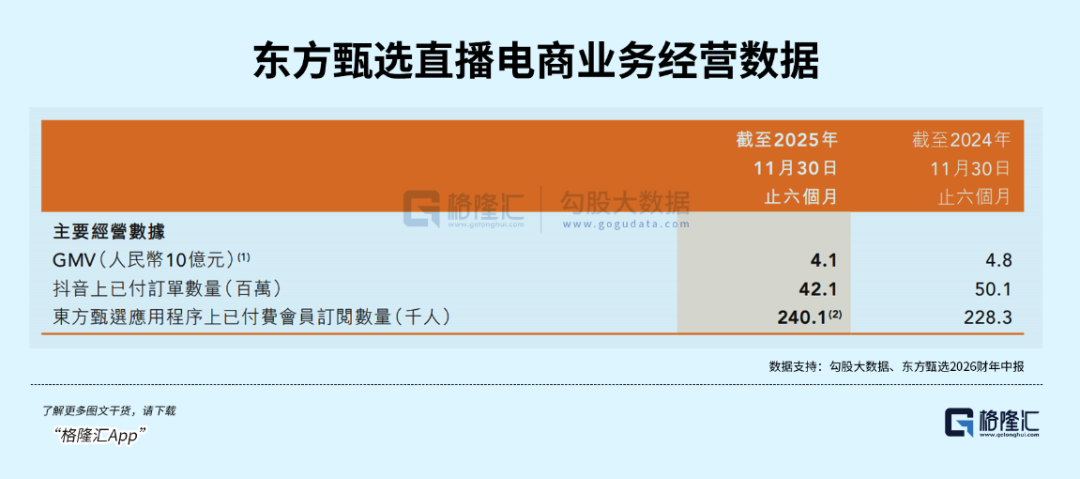 2026财年中期,东方甄选总GMV为41亿元,较2025财年同期的48亿元大幅下滑,而2024财年同期,这一数据为57亿元。