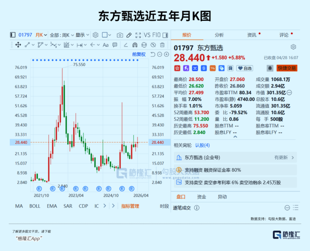 而自2023年年初高点以来,东方甄选股价持续失血,已然跌去超过60%,市值仅剩300亿港元。