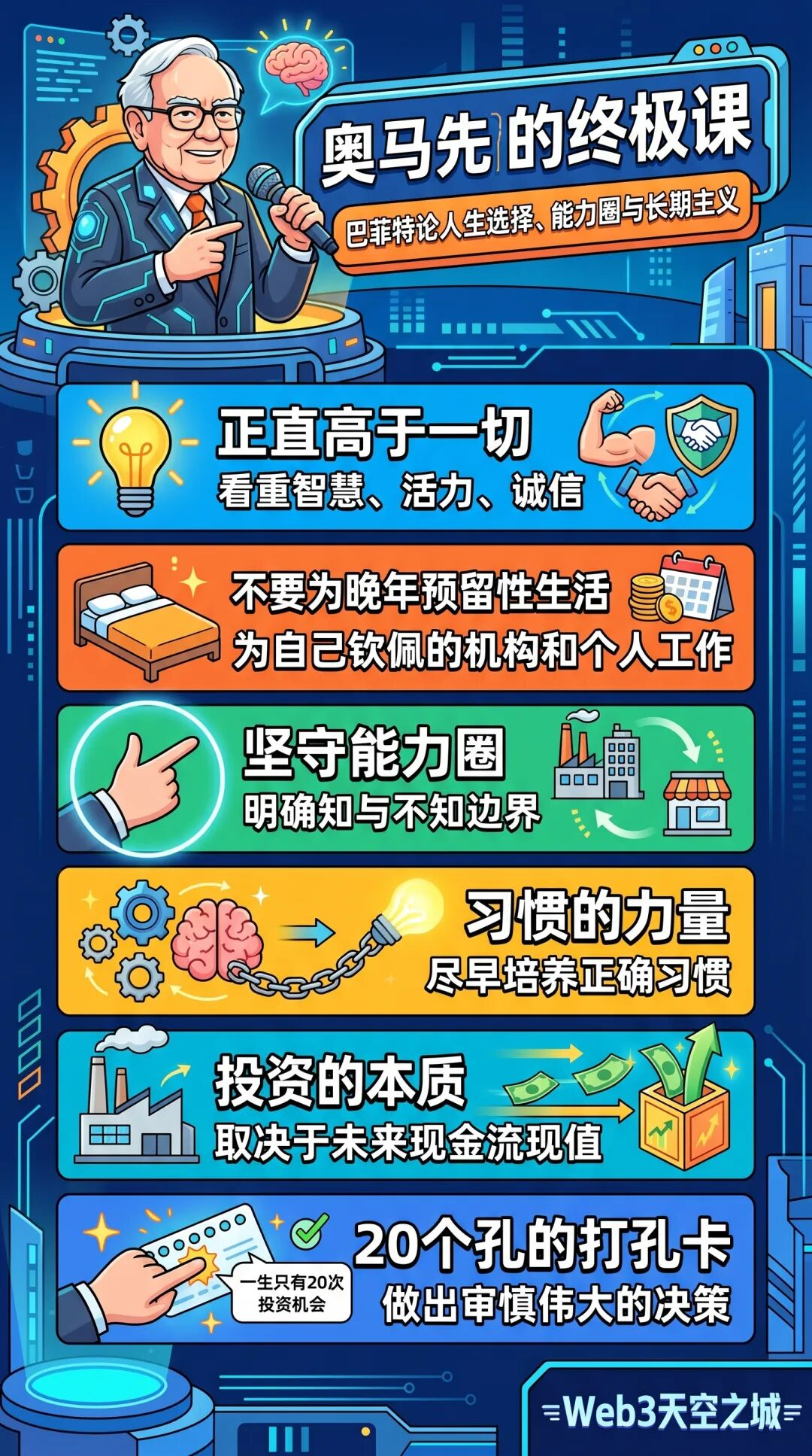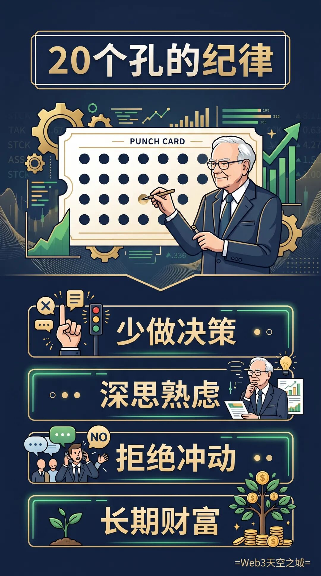 巴菲特用他一生的思考告诉我们:无论是投资还是人生,最重要的资产莫过于那张“20个孔的打孔卡”。如果你珍视每一次决策,只在最确定的时刻挥棒,财富与人生的复利终将降临。
