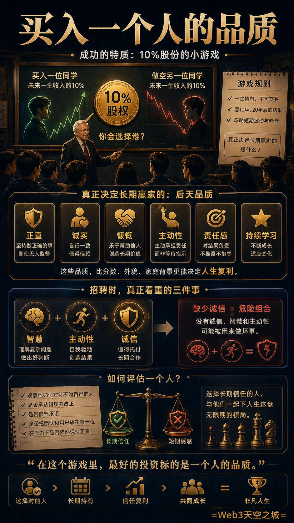 巴菲特向听众提出了一个有趣的思维实验:如果可以挑选一位同学,并获得其未来余生收入的10%,你会选择谁?他指出,最终胜出的往往不是智商最高或背景最深的人,而是那些具备正直、诚实、慷慨等后天品质的人。