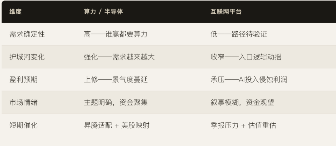 换句话说,传统互联网大厂面临的不是一场业绩危机,而是一场“叙事危机”。旧的估值锚点——流量垄断、用户规模、变现效率——已经开始松动;新的估值锚点——AI时代的护城河在哪里、增量在哪里——尚未被市场认可。在这个叙事真空里,资金选择了用脚投票,把钱挪向逻辑更确定的算力方向。