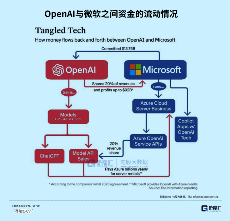 微软在Azure上出售OpenAI的服务,要给OpenAI分20%的利润;OpenAI则要把自己总收入的20%分给微软。