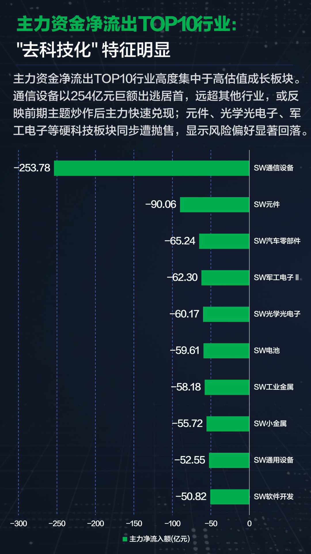 从行业流向看,主力资金净流出高度集中于高估值成长板块:通信设备以254亿元巨额出逃居首,远超其他行业,或反映前期主题炒作后主力快速兑现;元件、光学光电子、军工电子等硬科技板块同步遭抛售,显示风险偏好显著回落。