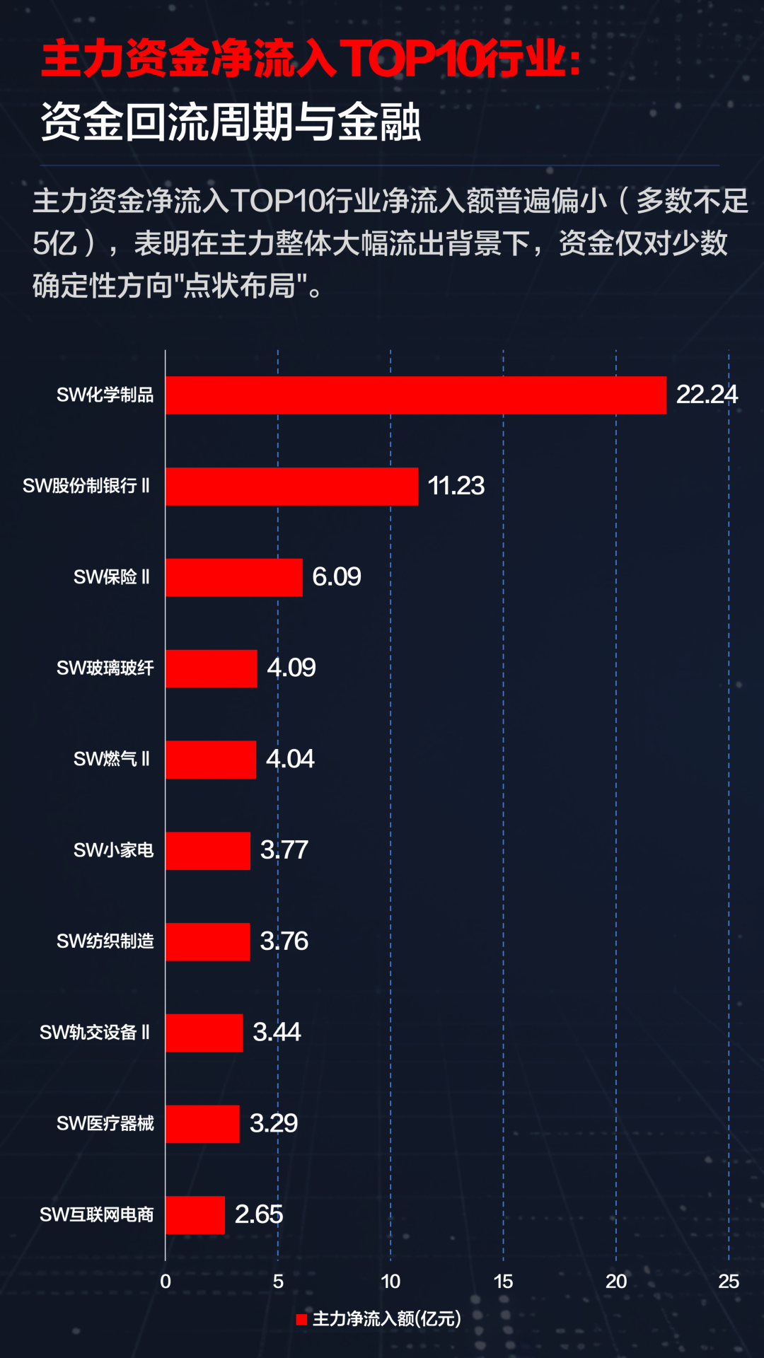 值得关注的是,主力资金净流入TOP10行业净流入额普遍偏小,多数不足5亿,表明在主力整体大幅流出背景下,资金仅对少数确定性方向"点状布局"。