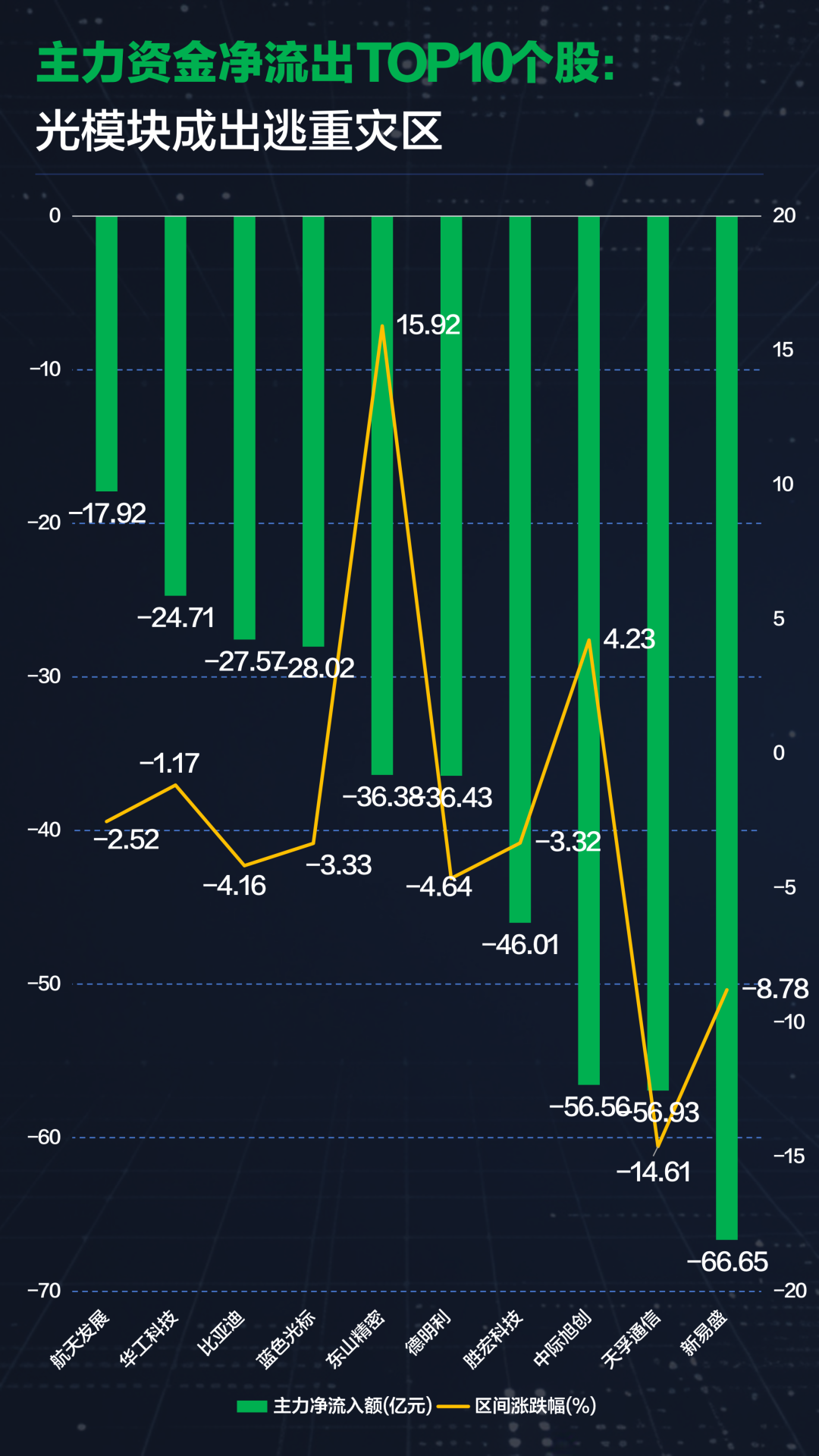 从个股偏好看,散户资金净流入TOP10个股聚焦光通信与AI应用等方向,而消费电子与AI算力则遭冷遇。