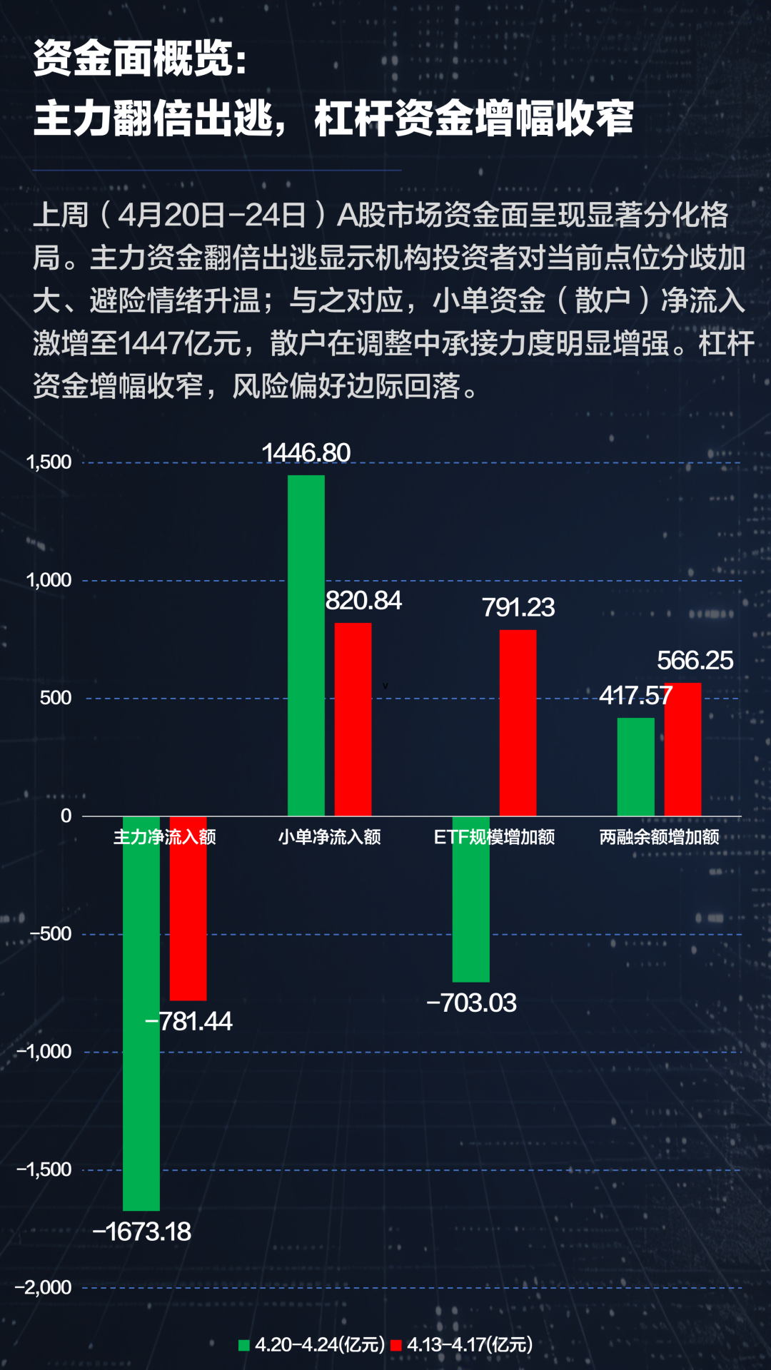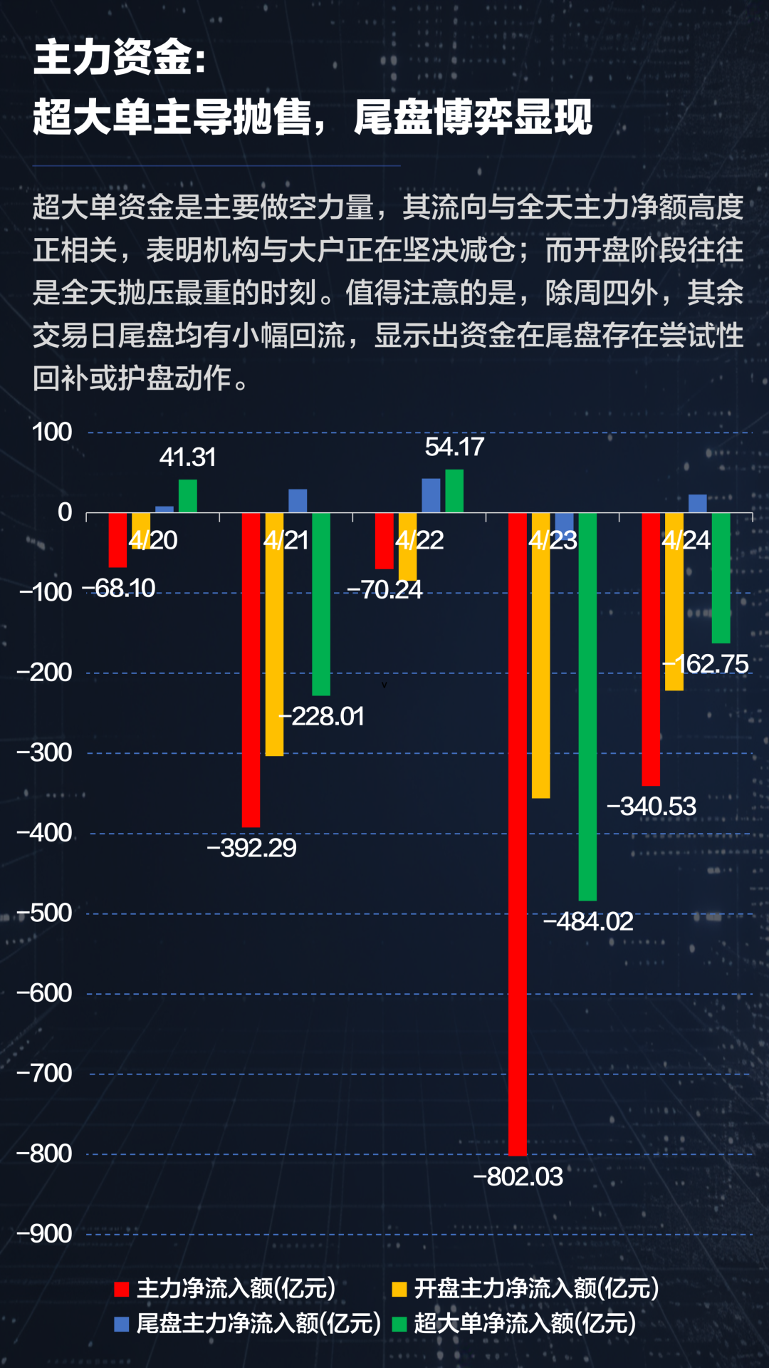 主力资金呈现加速净流出态势,全周累计净流出超1600亿元,尤以周四(4月23日)单日流出802亿元最为剧烈。