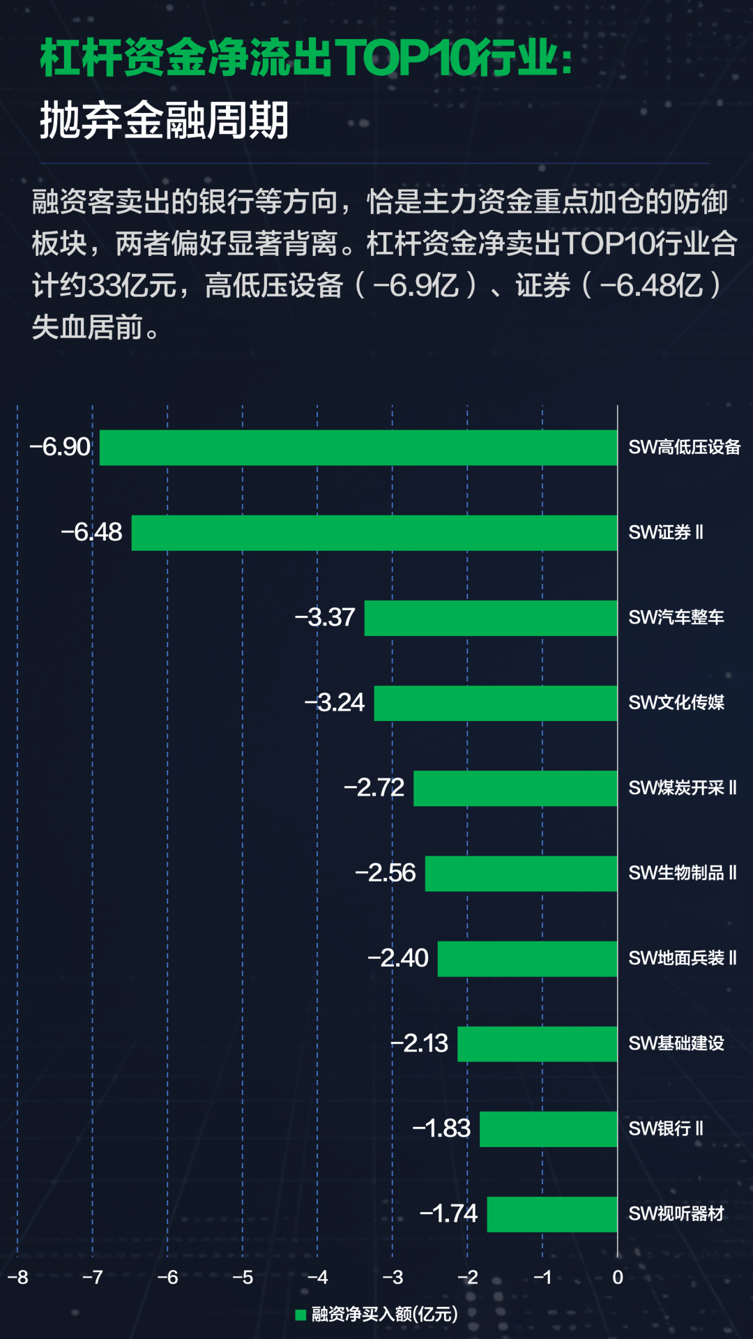 从流出方向看,杠杆资金净卖出TOP10行业合计约33亿元,高低压设备、证券、汽车整车等失血居前。融资客卖出的银行等方向,恰是主力资金重点加仓的防御板块,两者偏好显著背离。