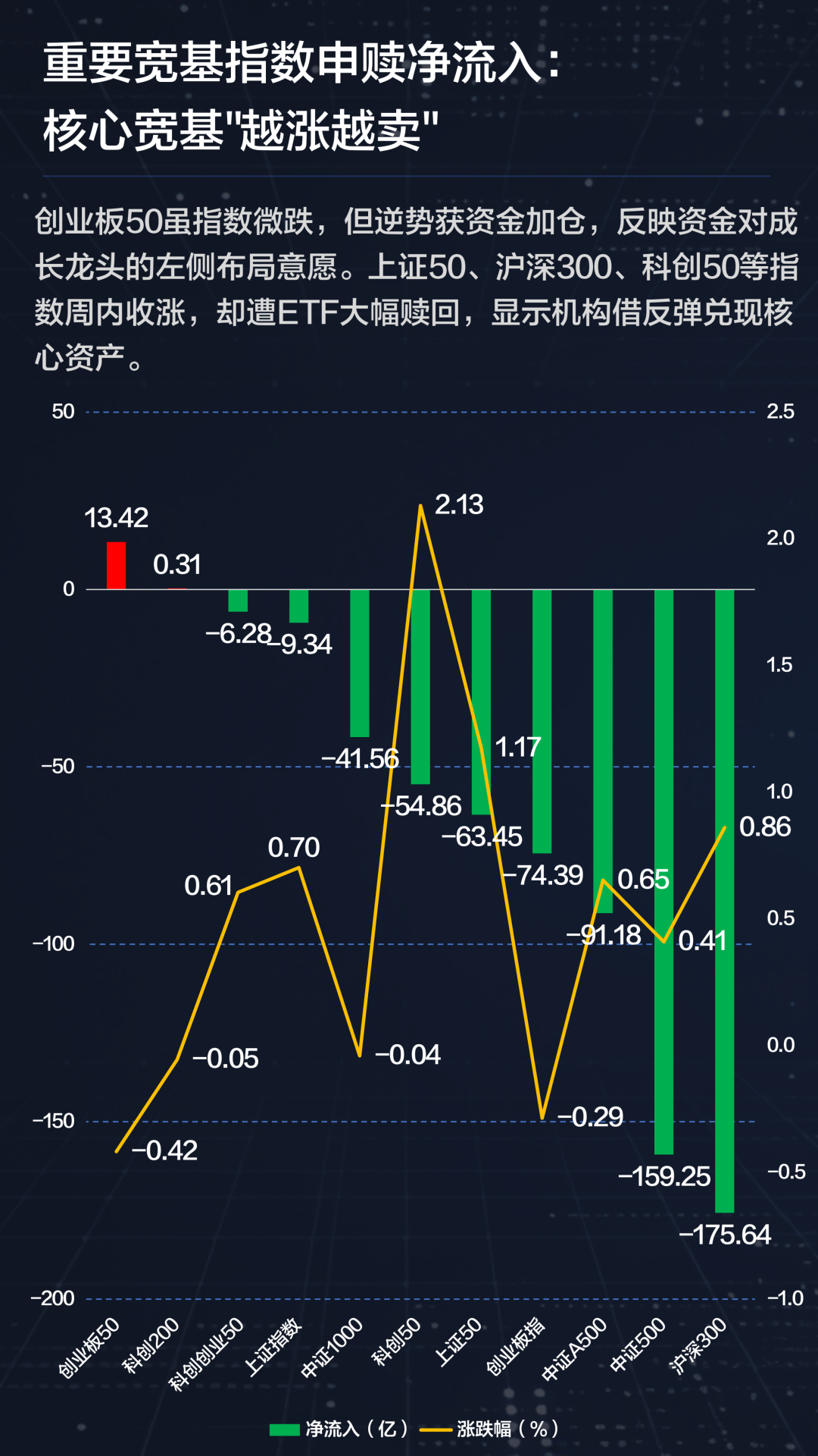 与此同时,ETF市场也在上演“越涨越卖”的背离戏码:上证50、沪深300、中证500等核心宽基周内收涨却遭赎回,创业板50逆势获资金加仓。