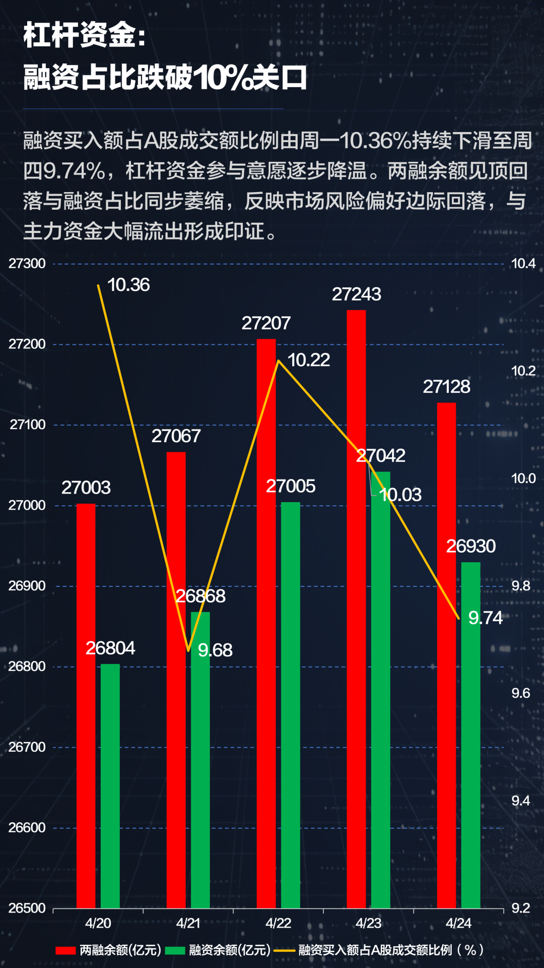 两融余额先扬后抑,周四触及27243亿元阶段新高后回落至27128亿元,全周净增125亿元,增幅较上周明显收窄。融资买入额占A股成交额比例由10.36%持续下滑至9.74%,跌破10%关口,杠杆资金参与意愿逐步降温。