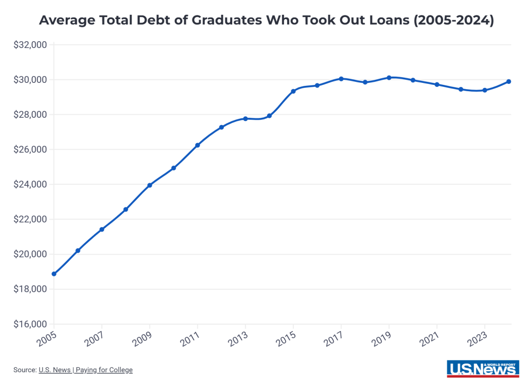 ■US.News从992所院校在年度调查中提供的数据显示,2024级毕业生在攻读学士学位期间所借的学生贷款平均金额为29,890美元。这一数字比2015级毕业生所承担的金额高出560美元,表明在这十年间学生所借金额大致增长了2%