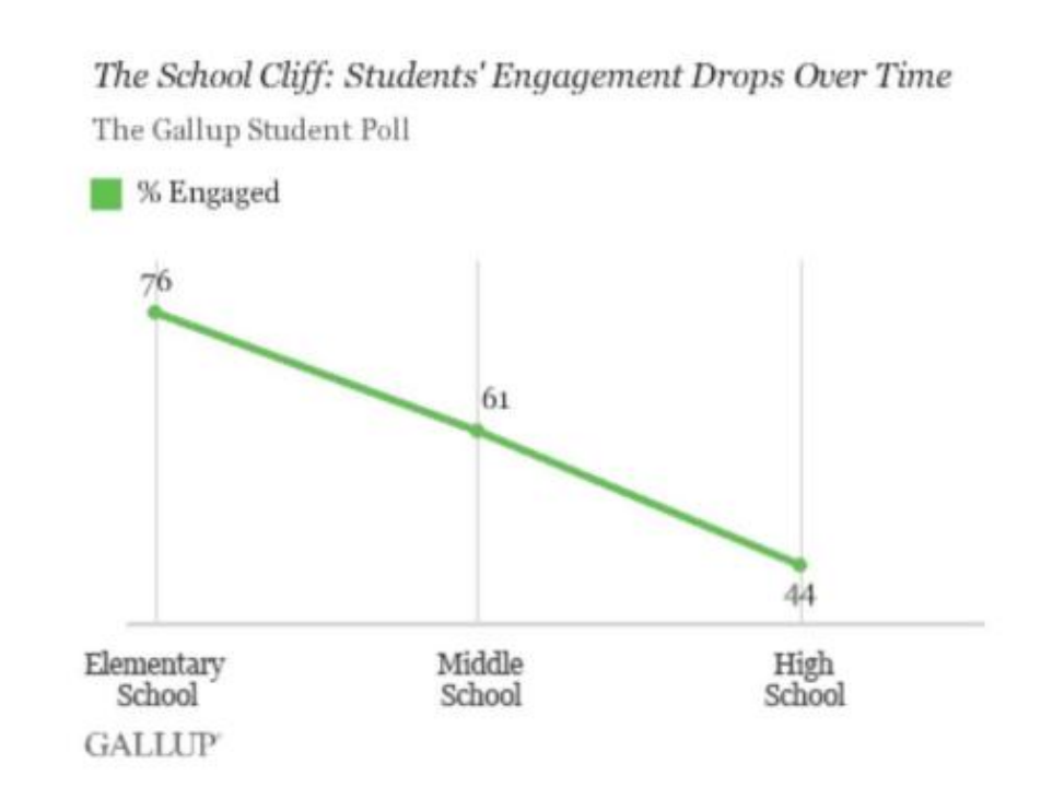 知名调研机构盖洛普在2012年访谈了超过5万名美国5-12年级的学生,发现学生对于学习的积极性,从小学时的76%降至高中时期的44%,不少学生半途退学。