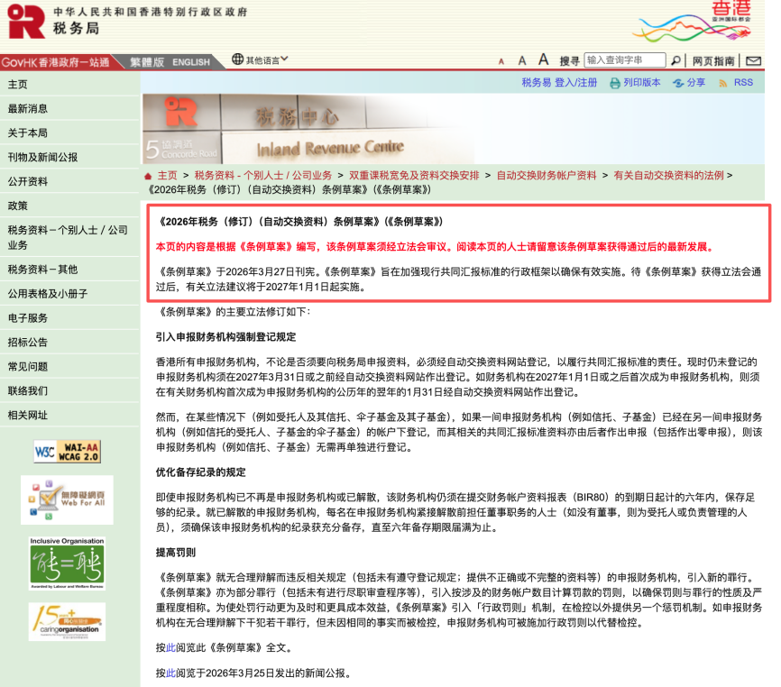 巧合的是,几乎同时,香港《2026年税务(修订)(自动交换资料)条例草案》提交立法会首读。