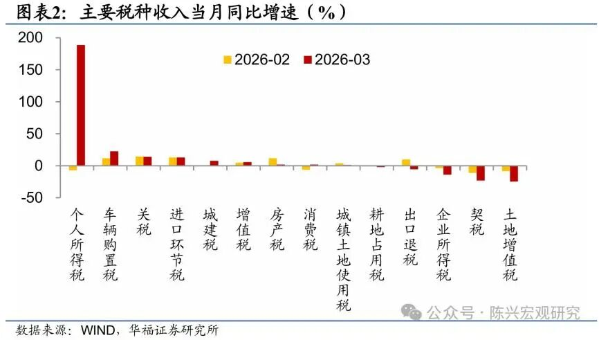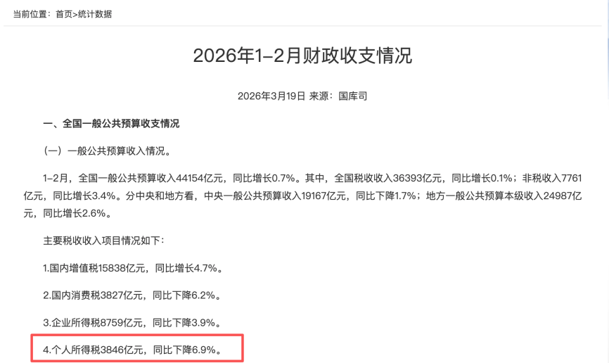 第一,据财政部数据,2026年前两个月,个税增速“仅”为-6.9%,一个月时间,个税就从负转正,且快速增长,着实超预期;