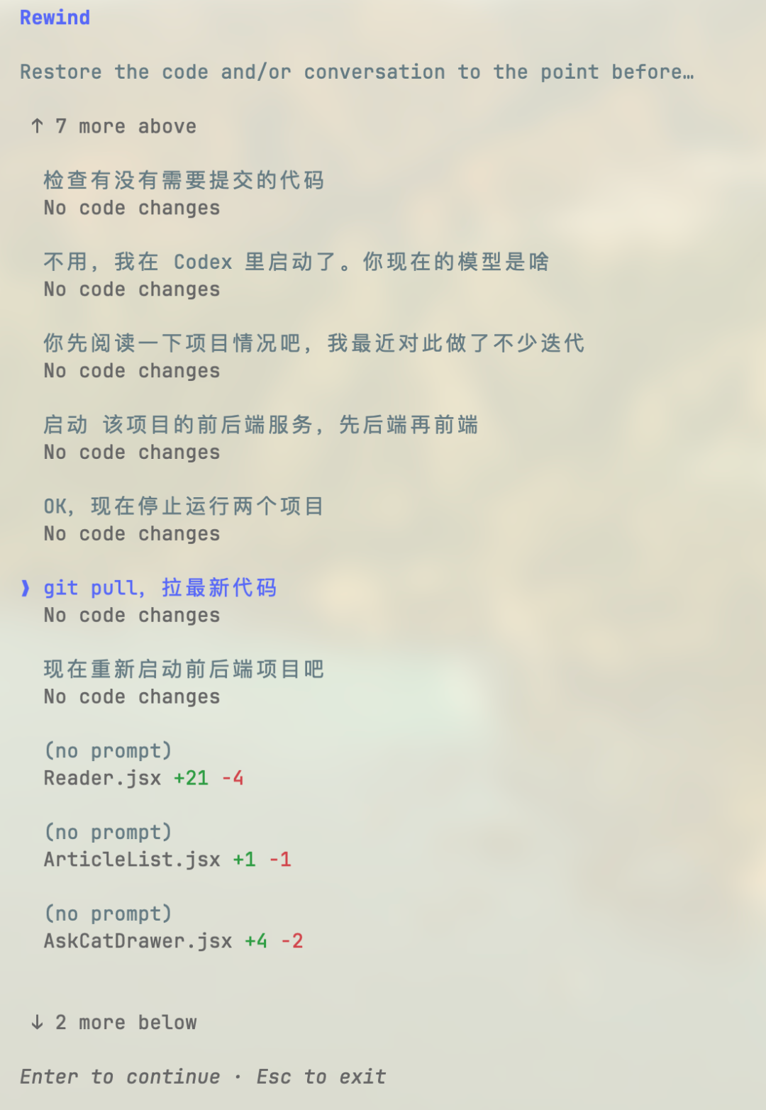 Claude Code里有个rewind功能我还挺喜欢的,你可以随时退回到之前的某个状态: