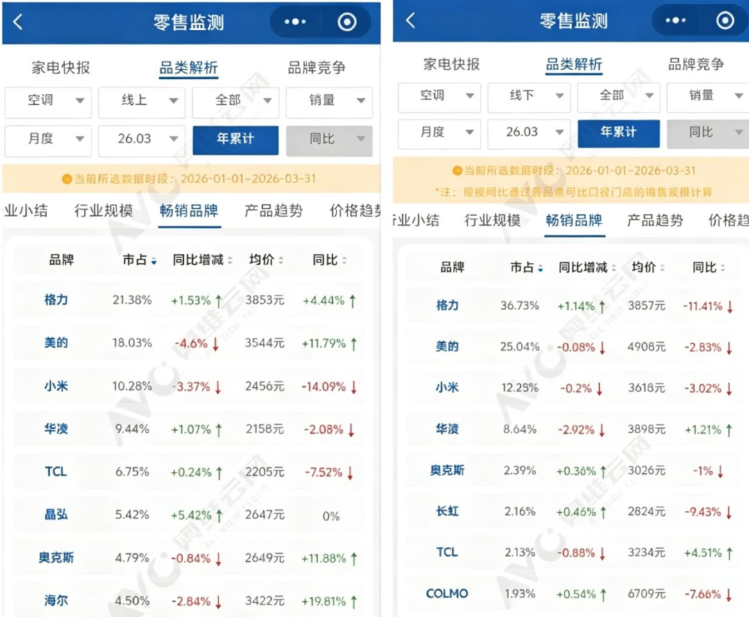 奥维云指出,一季度,线下高端整体缩水,其中在柜机市场,中高端机型占比出现下滑,消费者对大额支出的谨慎态度抑制了线下高端柜机需求。以至于原本清晰的价格分层被逐渐抹平。