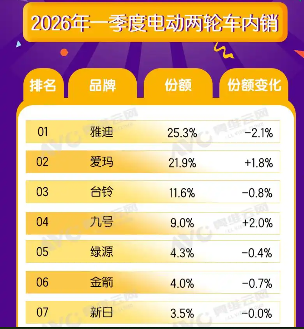 目前来看,新日电动车距离重回第一的目标正在越来越远。根据奥维云网公布的今年一季度两轮电动车内销数据,新日电动车份额为3.5%,排名第七,与雅迪25.3%和爱玛21.9%的份额相比差距巨大。