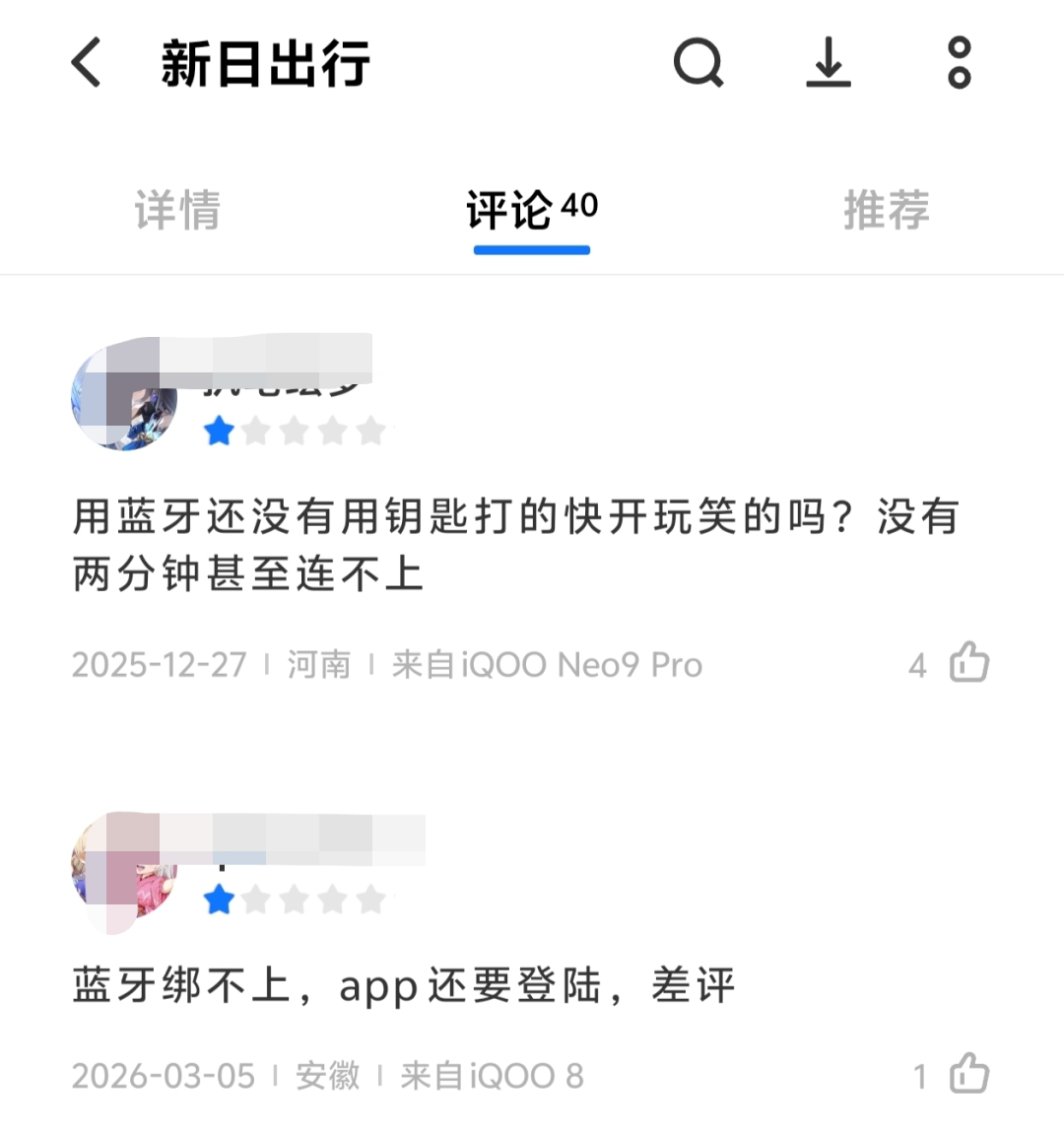 作为老牌电动车企业之一,新日电动车确实在不断向智能化的方向转型,但目前来看用户的反馈并不理想。以新日电动车推出的新日出行App为例,《次世代车研所》栏目发现,其在某安卓手机应用商店的评分仅为1.8分,远低于其他同行。不少用户给出1分并吐槽称,“蓝牙绑不上”,“用蓝牙还没有用钥匙打开得快,开玩笑的吗?没有两分钟甚至连不上”,“一直闪退进不去,能不能赶紧下架”。