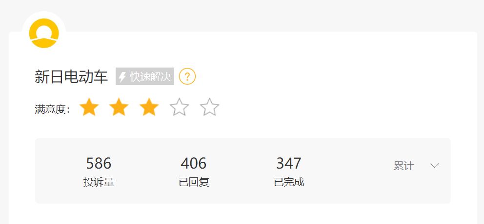 尴尬的是,新日的质量和口碑并不算太好。在黑猫投诉上,其累计投诉量达586件,案例涉及门店不履行三包承诺、电池故障、虚假宣传、货不对板等问题。有用户在骑行中遭遇后轮电机中轴断裂,人直接摔倒在地;还有用户购车半年电机坏了,购买第二辆当月电池又坏了。