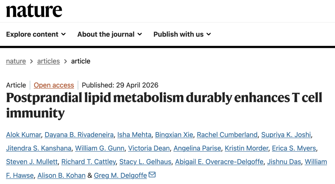 2026年4月29日,匹兹堡大学的研究人员在国际顶尖学术期刊Nature上发表了题为:Postprandial lipid metabolism durably enhances T cell immunity的研究论文。