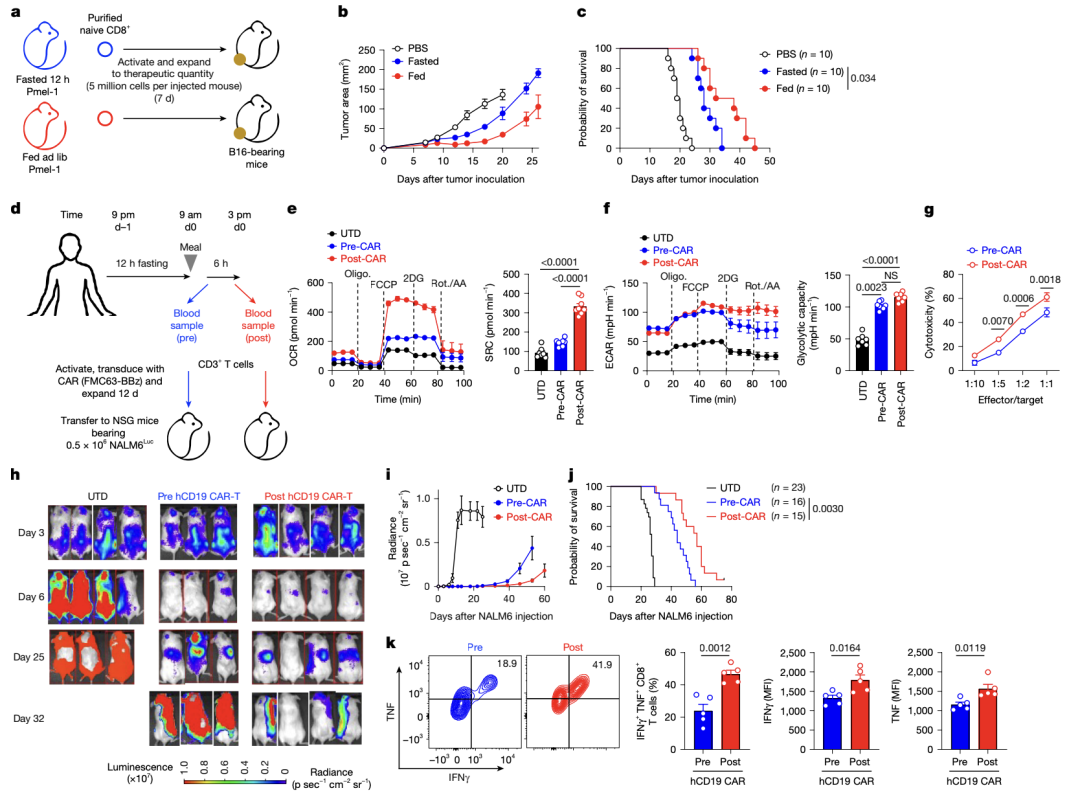 为了将这些发现应用于CD19靶向的CAR-T细胞的人类细胞治疗,研究团队从同一个人体内获取了空腹状态下和餐后的T细胞,然后分别构建为CD19靶向的CAR-T细胞。结果显示,餐后T细胞来源的CAR-T细胞具有更高的呼吸能力和线粒体ATP生成率,对CD19过表达的A549细胞更高的细胞溶解能力。在对白血病小鼠模型的治疗中,两组CAR-T细胞均表现出初始治疗效果,但接受空腹CAR-T细胞治疗的小鼠肿瘤复发更频繁,而接受餐后CAR-T细胞治疗的小鼠生存期显著延长。
