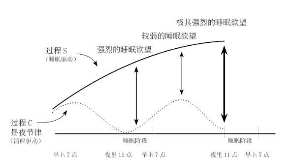 虚线是昼夜节律,称为过程C。它就像正弦波一样,有规律、重复性地先上升再下降,然后再一次上升和下降。对于大多数健康的成年人来说,昼夜节律的激活信号会在午后达到顶峰。