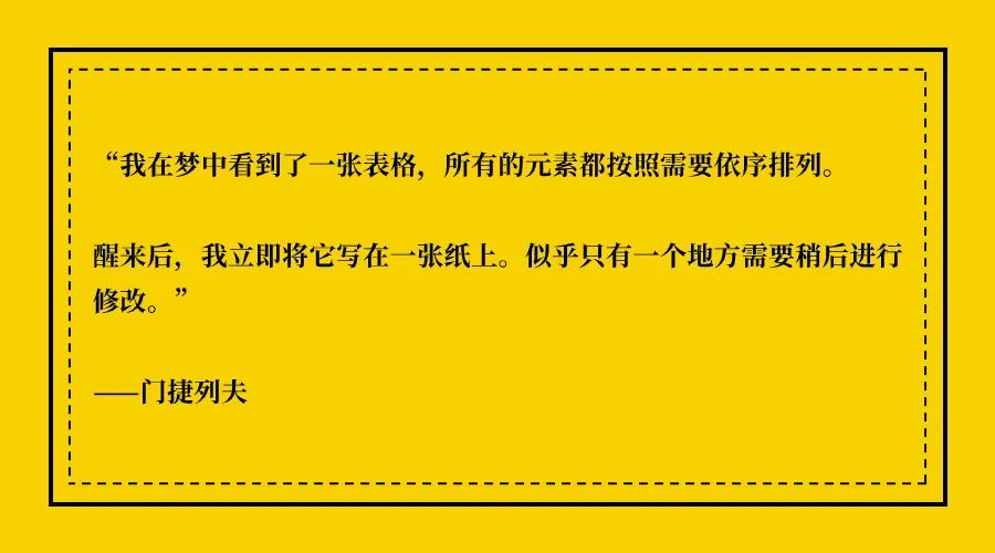 睡着之后,他做了一个梦,他的大脑在梦中完成了清醒时无法完成的任务。这个梦抓住了他脑海中萦绕着的各种各样的组成部分,并且在一瞬间发挥了创造性的才智,将它们拼凑在一个神圣的表格中,每一行(周期)和每一列(族)都呈现出原子和轨道电子特性逐渐变化的逻辑规律。