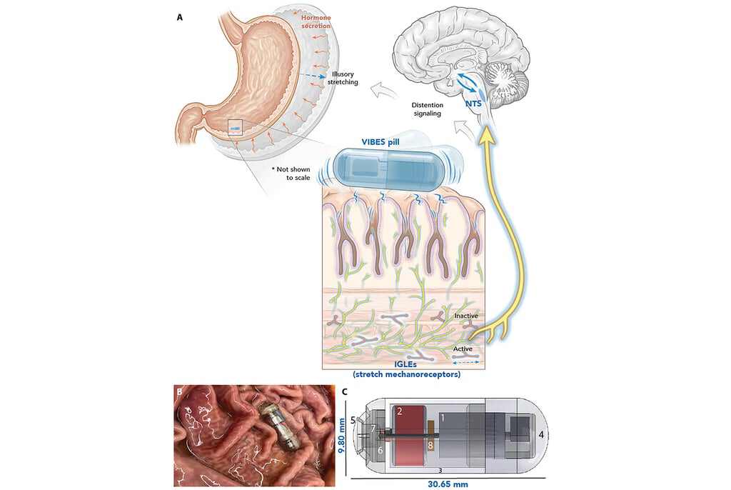 它看起来就像一颗维生素胶囊,但内含乾坤,包含振动马达和银氧化物电池,当胶囊进入胃中,胃酸溶解外层,电路就将接通,从而开启震动。而震动会刺激胃壁的机械刺激感受器,通过迷走神经向大脑发送信号,使得大脑下令启动多种激素,从而减少饥饿感并促进消化。