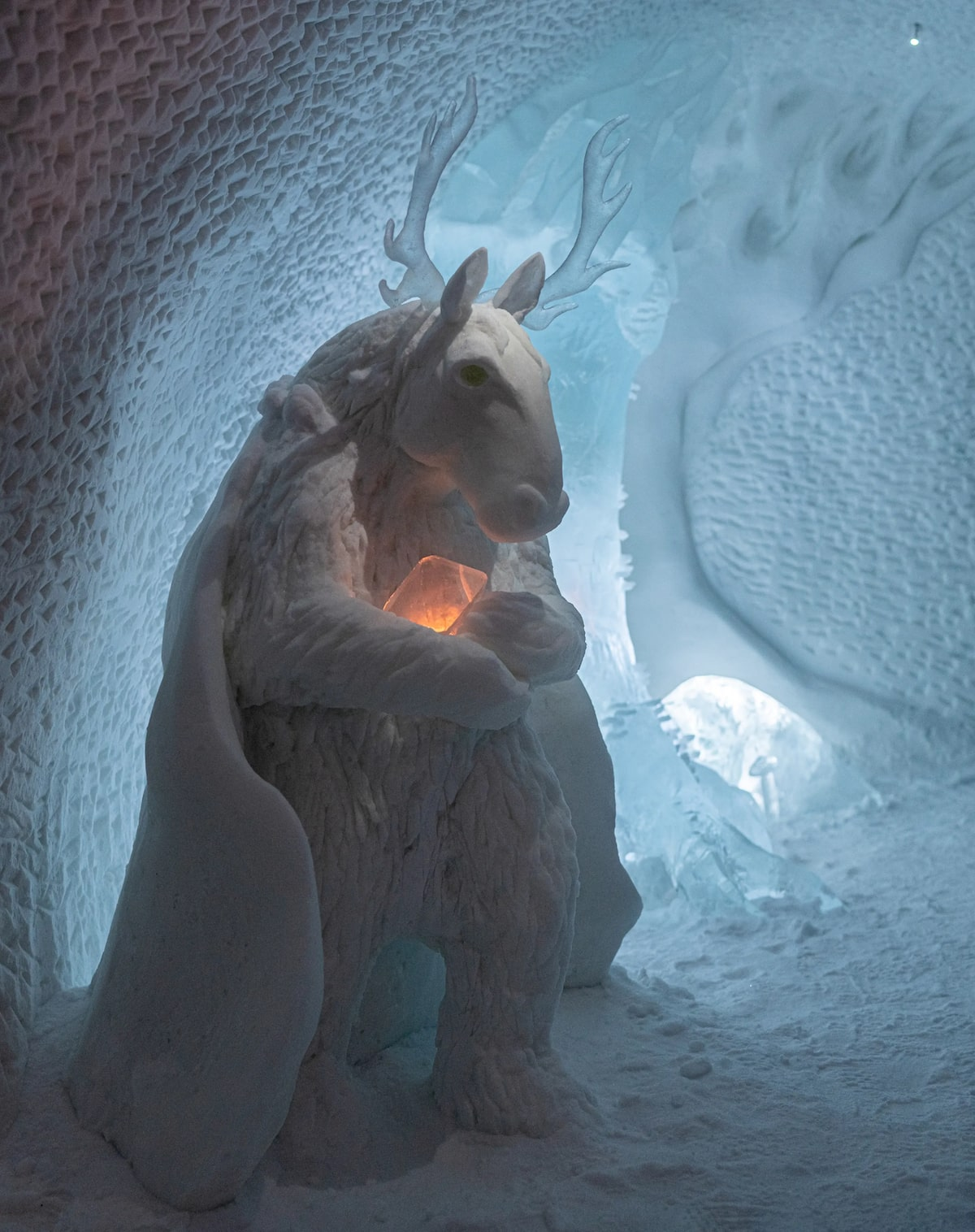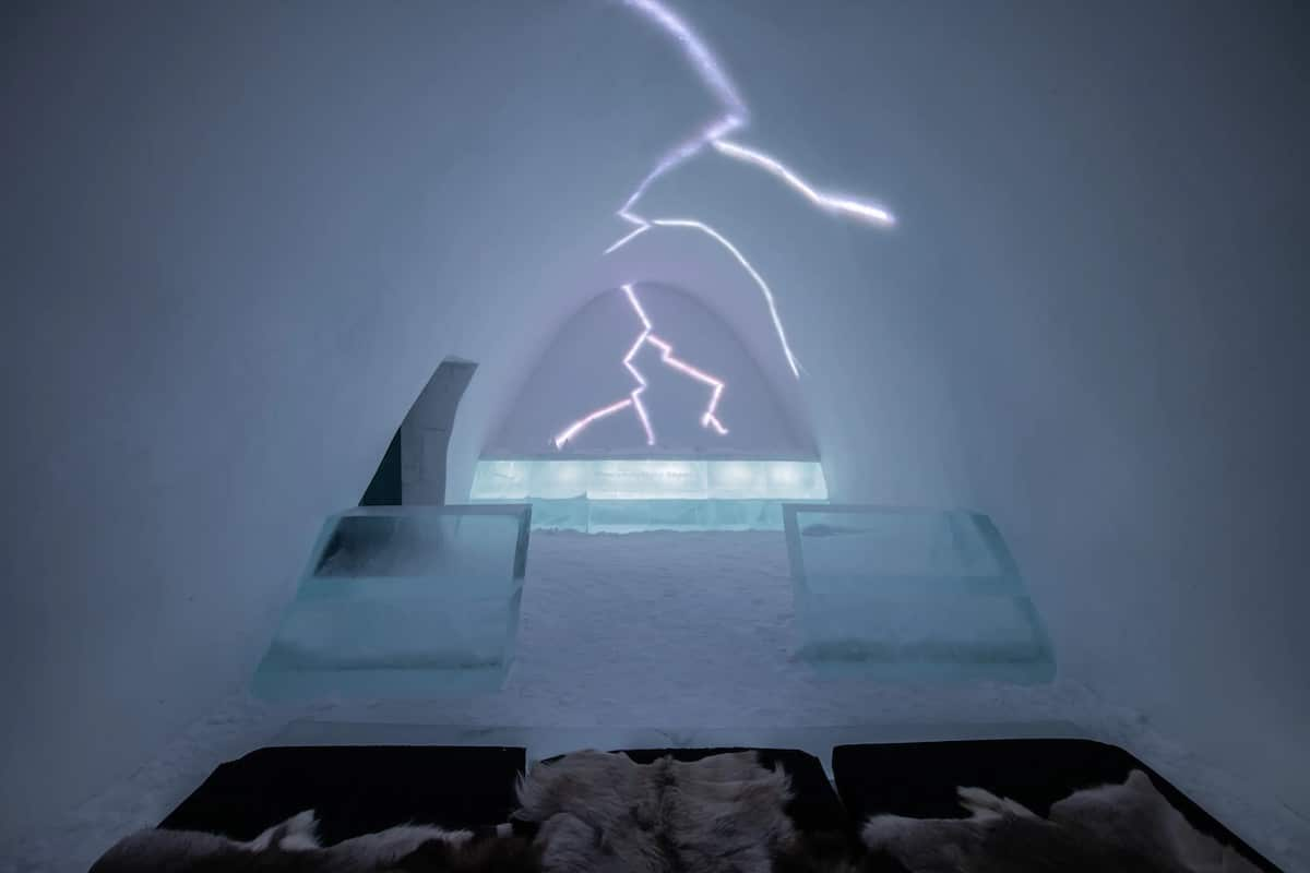 所以每一年的冰雪酒店都不尽相同,因为每一次都是重起炉灶,今年的冰雪酒店从冰冻的托尔纳河中提取冰块,然后交由艺术家塑造成不同主题的冰雕客房。