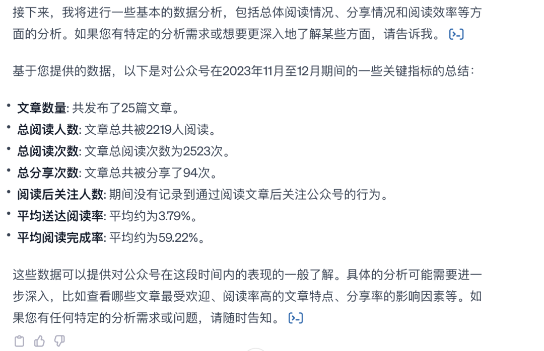 首先进行公众号的整体分析,Data Analyst会自动识别表格中的每个字段,接着直接分析以下数据: