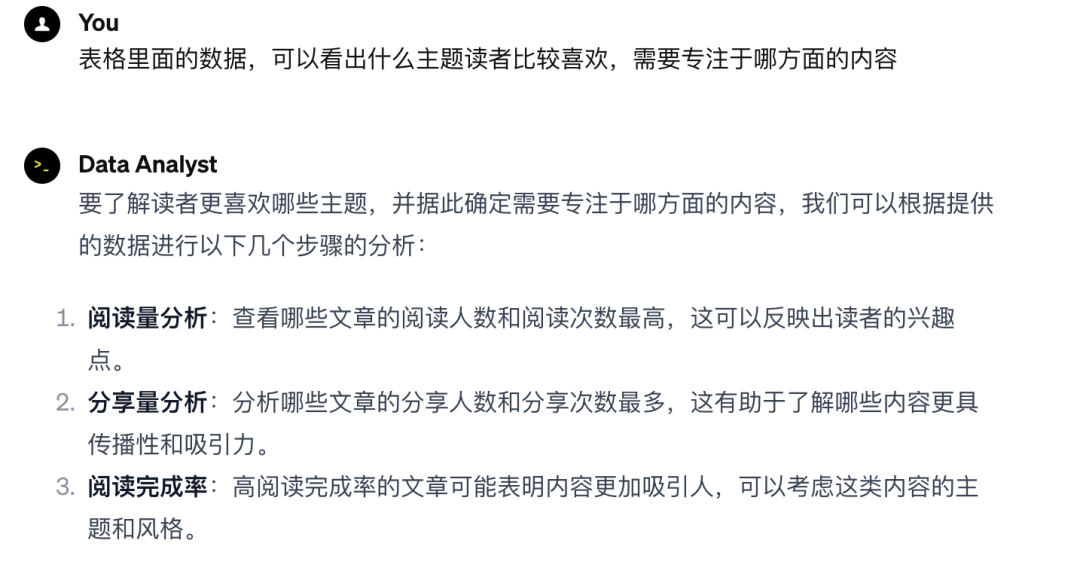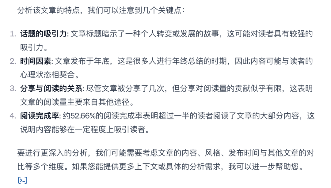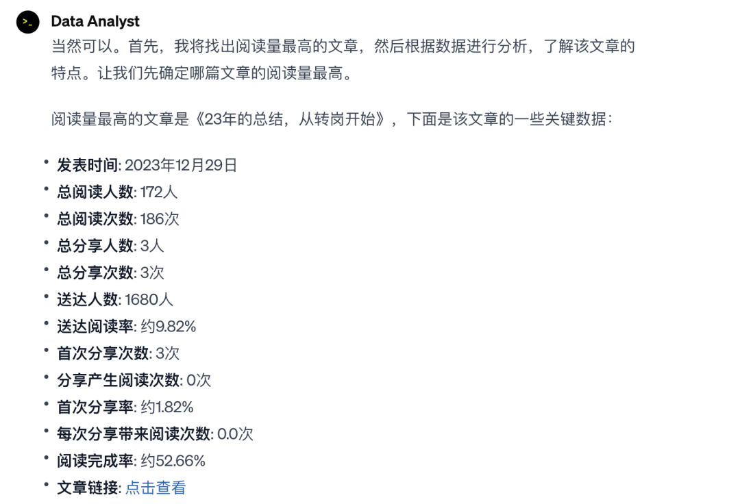 我让Data Analyst分析哪篇文章阅读量最高,以及具体的特征是什么,以便更好地借鉴该文章的内容。