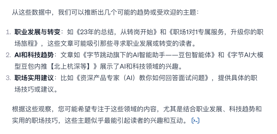 通常情况下,这些数据需要我用表格来手动处理,但没想到ChatGPT一下子就分析出来,并将结果呈现给我。