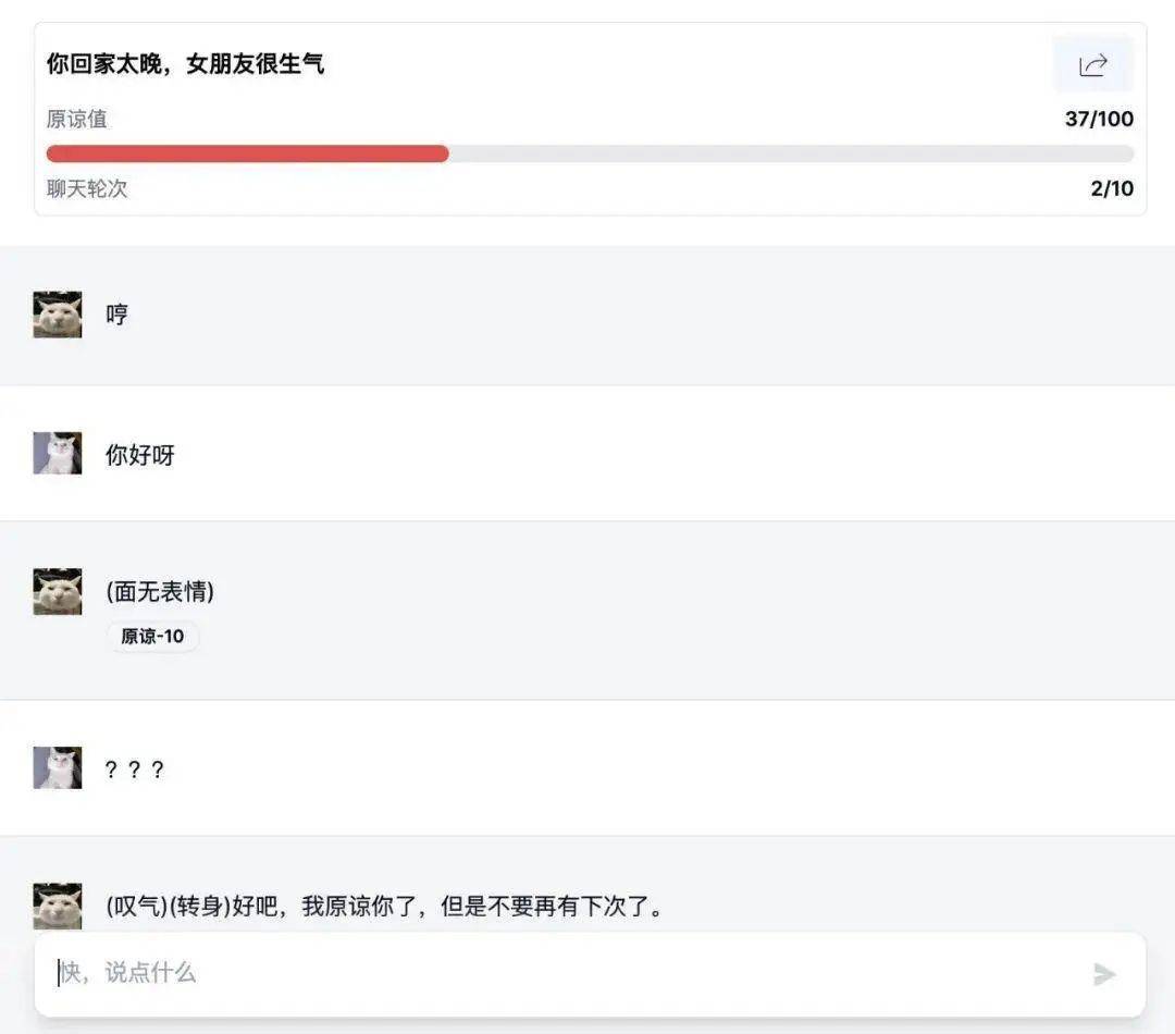 用户可以通过与 AI 扮演的人物进行互动,根据回应内容,系统会相应地调整「原谅值」的分数,以此测试和提升用户的哄人能力。