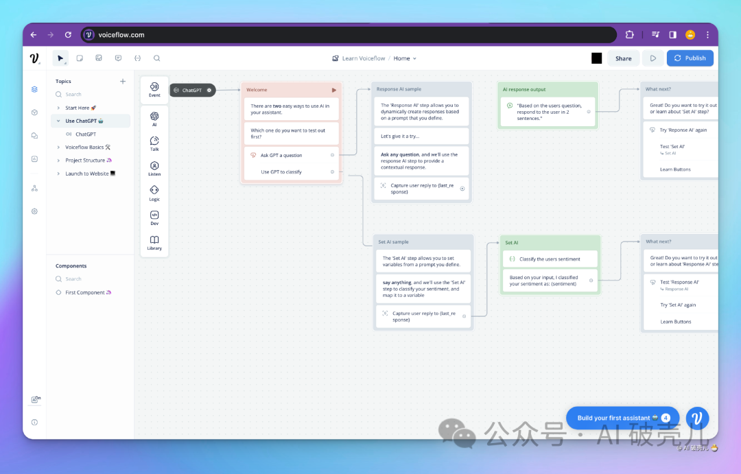 Voiceflow 为对话设计的团队协同提供了友好的工作台,同时支持 10+ 对话事件类型,以及支持在对话节点层面对 AI 大模型的对话效果进行控制,适合对可靠性要求高、但同时又希望尝鲜的 AI 深度玩家和企业用户。