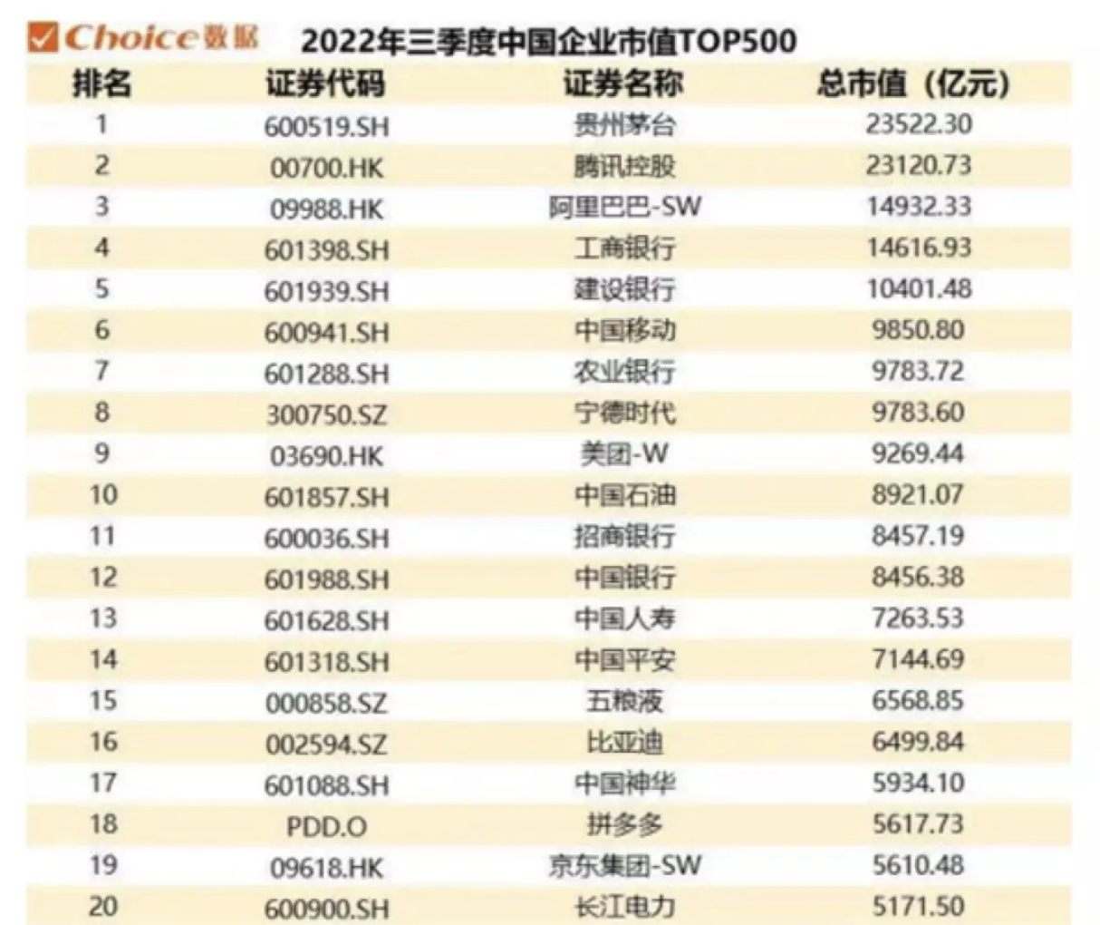 【贵州茅台日赚1个多亿,市值超过腾讯位列第一】据潇湘晨报,Choice数据显示,2022年三季度中国企业500强总市值约为63.27万亿元,贵州茅台超过腾讯控股成为三季度市值最高的企业,总市值2.35万亿元,阿里巴巴位列第三。