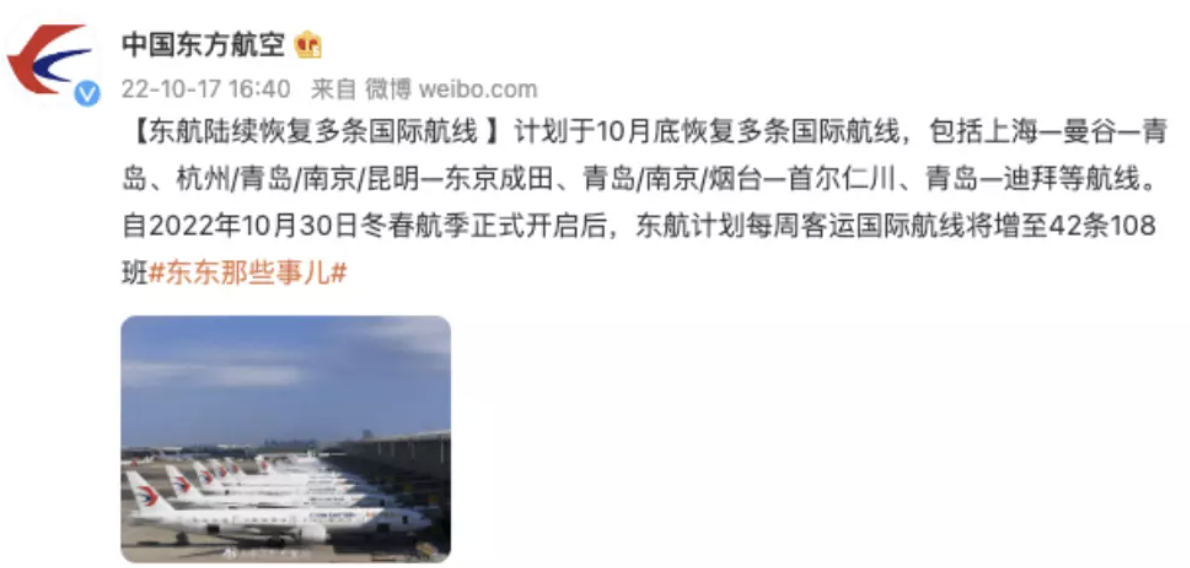 【东方航空计划于10月底恢复多条国际航线】据界面新闻,10月17日,中国东方航空官方微博宣布,计划于10月底恢复多条国际航线,包括上海—曼谷—青岛、杭州/青岛/南京/昆明—东京成田等航线。自2022年10月30日冬春航季正式开启后,东航计划每周客运国际航线将增至42条108班。