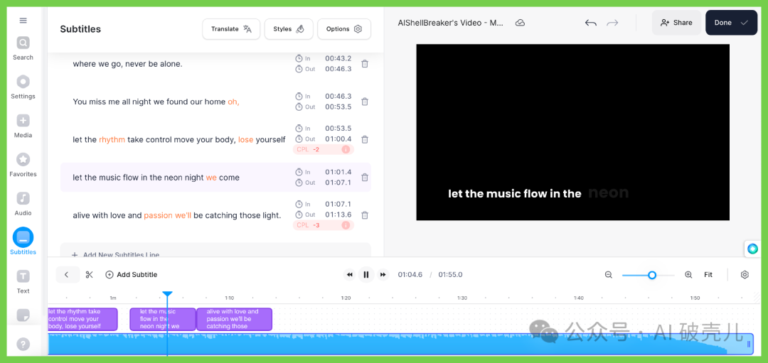 首先,用 AI 字幕生成的功能,直接为歌曲转写出歌词字幕。不得不说,非常准,几乎没有错别字。